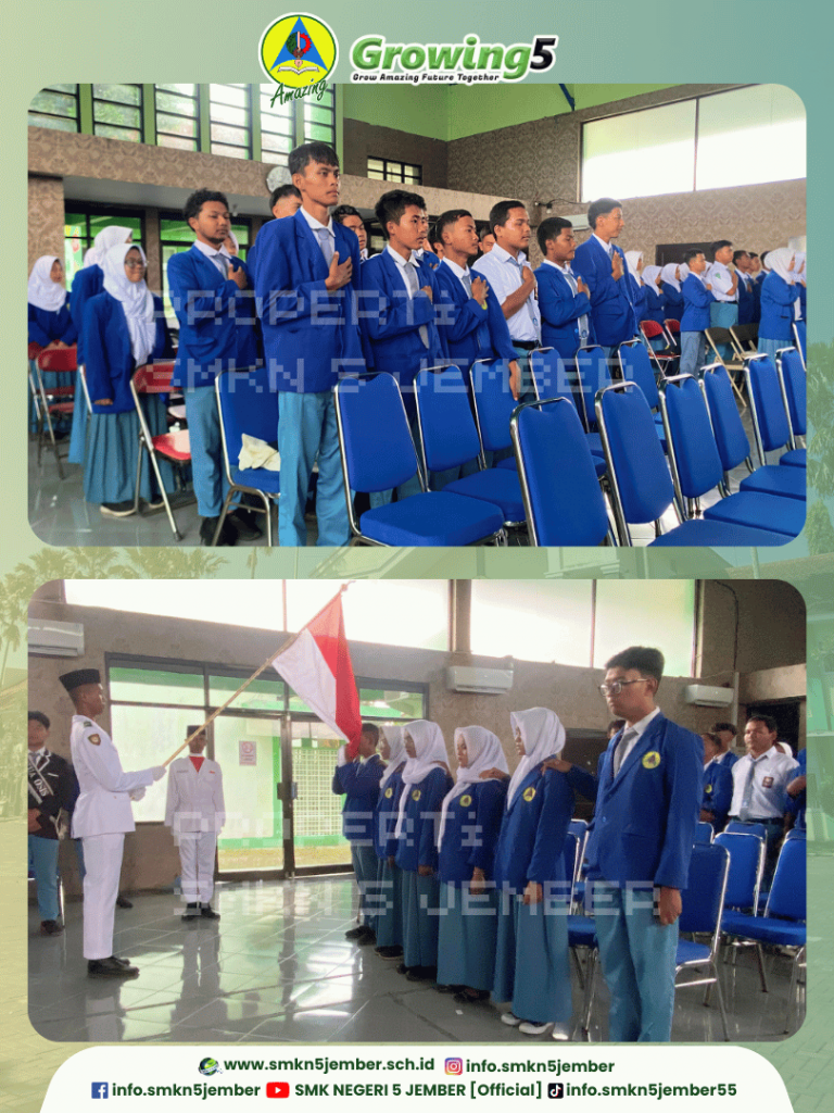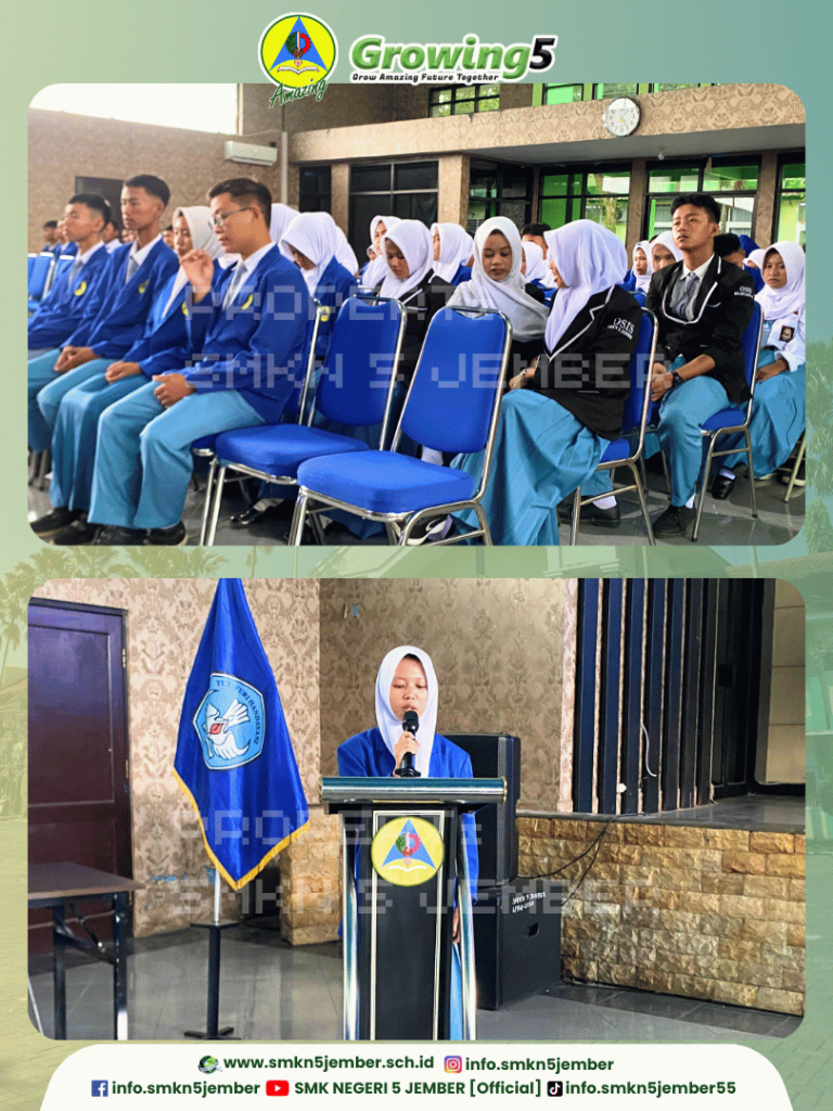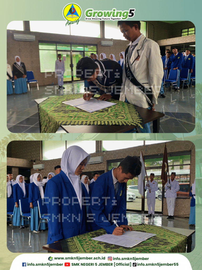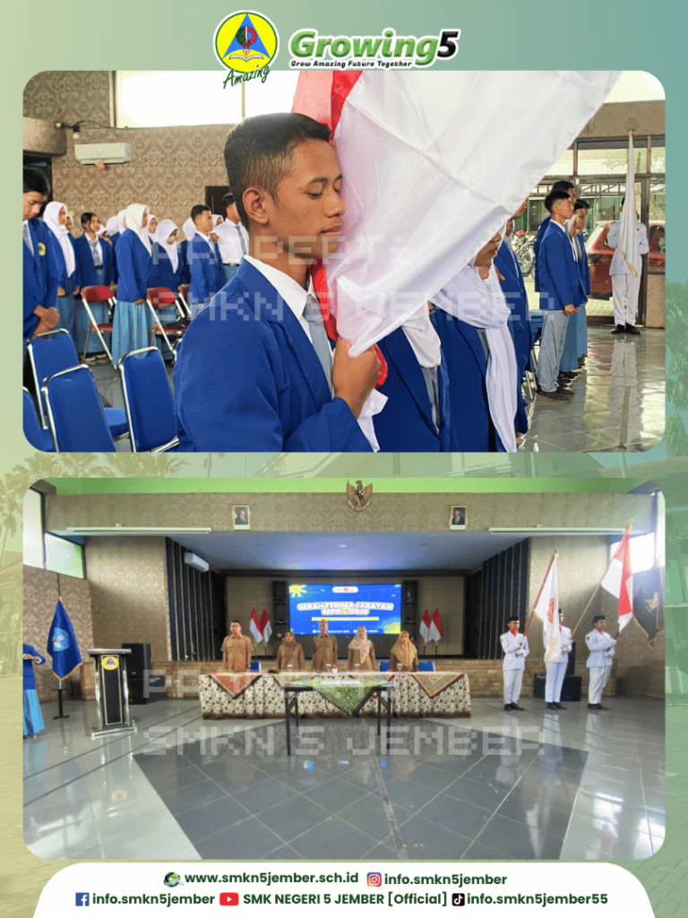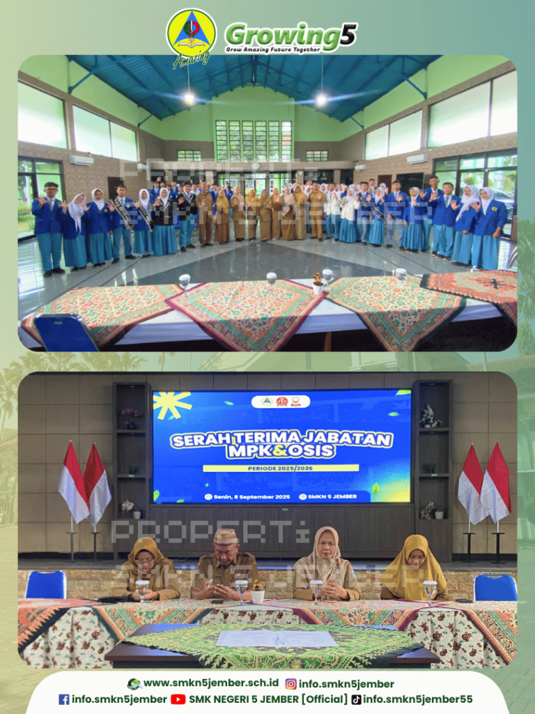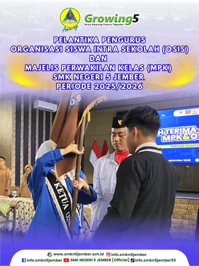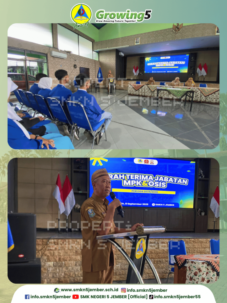 Siang ini, Senin, 8 September 2025 Aula SMKN 5 Jember, menjadi saksi berlansungnya prosesi pelantikan pengurus OSIS dan Majelis Perwakilan Kelas (MPK) dari pengurus demisioner kepada pengurus baru periode 2025/2026.