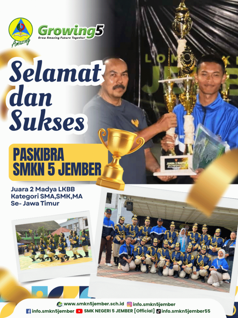 Kepala sekolah dan seluruh sivitas akademika SMK Negeri 5 Jember Mengucapkan, selamat kepada Tim Komando Pasukan Pengibar Bendera SMK Negeri 5 Jember (Kopaskama), ananda: